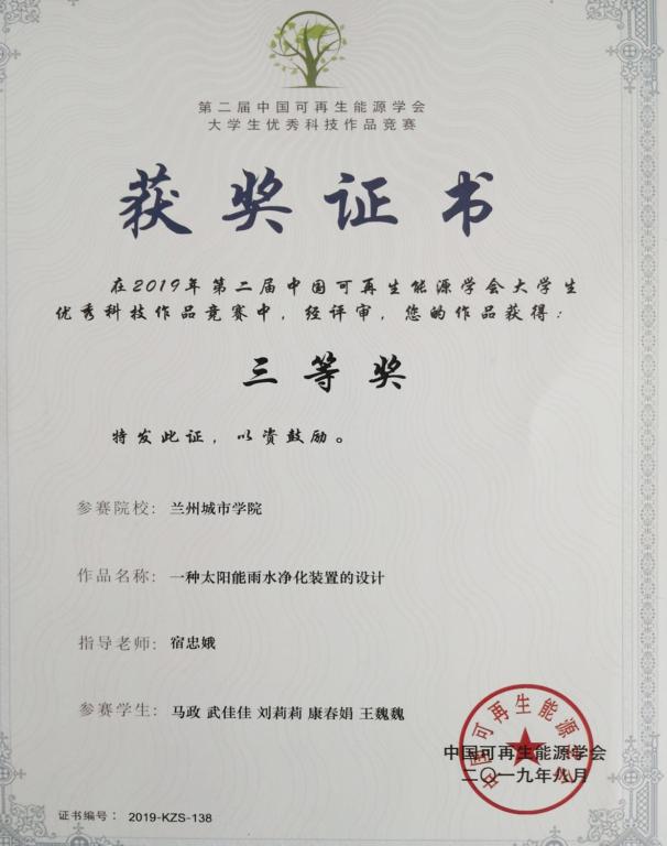 近日,第二届中国可再生能源学会大学生优秀科技作品竞赛全国总决赛在长沙理工大学举行。beat365培黎石油工程学院宿忠娥老师指导,学生团队马政、武佳佳、刘莉莉、康春娟、王魏魏的作品《一种太阳能雨水净化装置的设计》荣获全国三等奖。