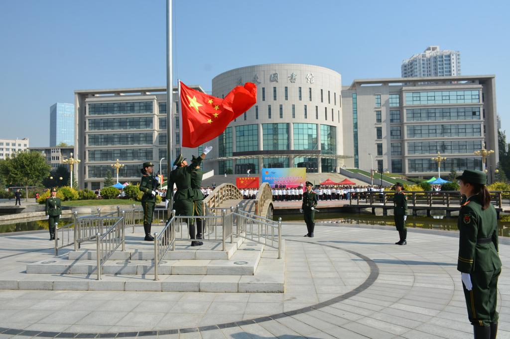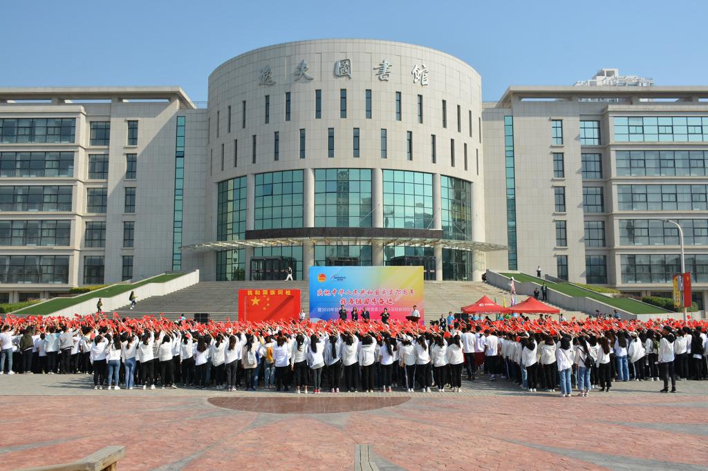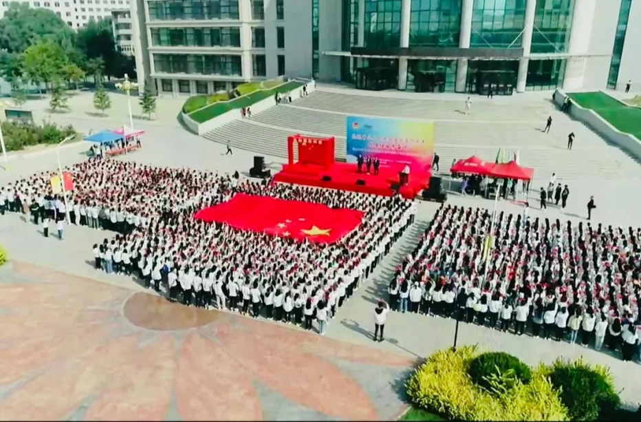 随后,全场师生挥动着手中的国旗,齐声高唱歌曲《我和我的祖国》和《光荣啊,中国共青团》,并手把手传递一幅巨大的国旗,最终在人群中央定格,用歌声和行动表达对祖国深深的祝福。