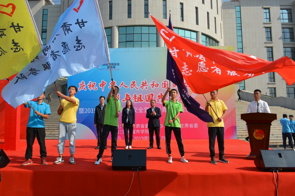 蒋小丽宣布“2019年甘肃省网络安全宣传周青少年日活动正式启动”,在场领导向在兰高校甘肃省网络文明志愿者服务队授旗。