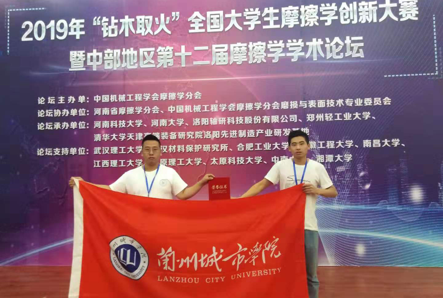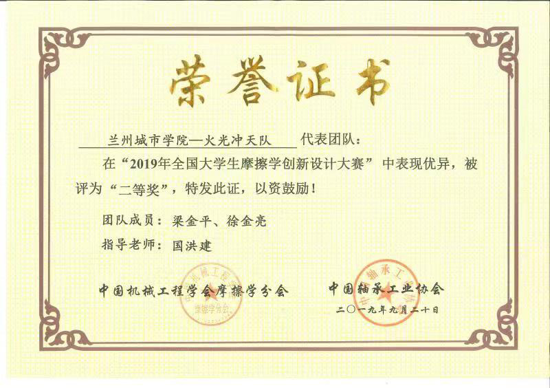 近日,2019年“钻木取火”全国大学生摩擦学创新设计大赛决赛在河南科技大学举行。由beat365培黎机械工程学院国洪建教授指导,焊接173班梁金平和徐金亮同学组成的“火光冲天”队荣获全国二等奖。