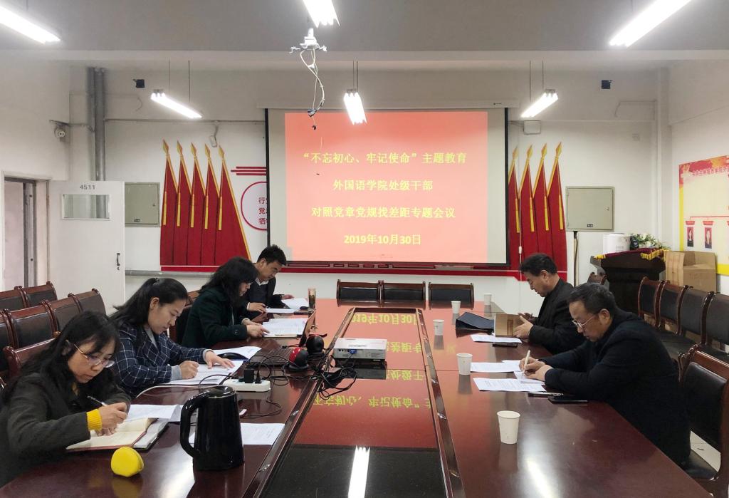 10月30日下午,外国语学院召开了“不忘初心、牢记使命”主题教育对照党章党规找差距专题会议。学校第二巡回指导组组长、校长张有明,指导组联络员、校长助理张社平到会指导。会议由外国语学院党委书记马忠丽主持,学院全体处科级干部参加了会议。