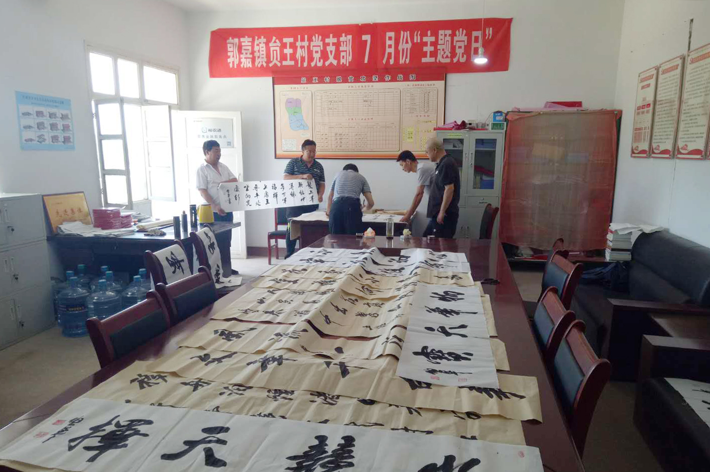 七月的郭家镇瓜果飘香,气候宜人。书协成员分别在郭嘉镇镇政府、邵咀村、马峡村、寺咀村、贠王村、中心小学六个点开展了书法传经送艺活动。成员们依照当地群众进行书法作品创作,其中大量作品是中堂、四尺屏、六尺屏、斗方等当地群众喜闻乐见的书法体式,共创作送出300余幅作品。