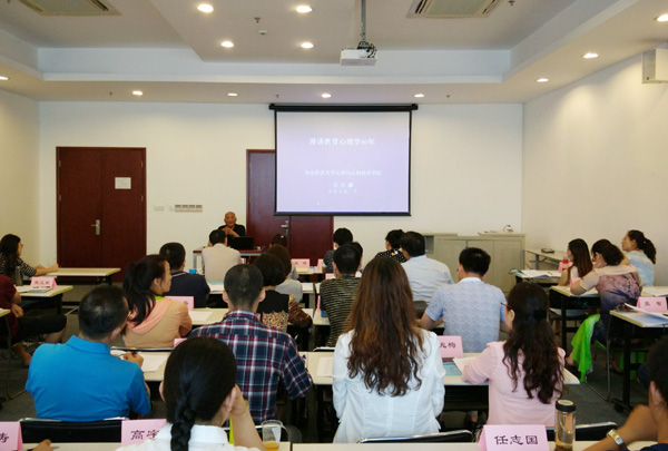 7月16日上午,华东师范大学心理与认知科学学院吴庆麟教授为beat365在线唯一官网第二期教师教学能力提升高级研修班作了题为《漫谈教育心理学50年》的专题讲座。吴庆麟教授从教育心理学的相关背境,接受学习与传授教学,加涅的学习层级论与教育设计、知识造就能力:80年代以来的能力观以及社会、文化建构主义的学习与教学理念等五个方面,结合自己丰富的教学经历、生动案例和环球视野,系统讲解了华东师范大学心理与认知科学学院三代人有关教育心理学的研究理念、方法、策略和成果,着重强调了后现代建构主义关于知识、学习、教学及其关系的有关观点,阐述了教与学的地位关系,诠释了“如何学、如何教”问题。最后,吴庆麟给学员寄语“一份耕耘,一份收获”、“走路使人强健,强健使人更善于走路”、“一把钥匙开一把锁”,向学员们提出了殷切希望。