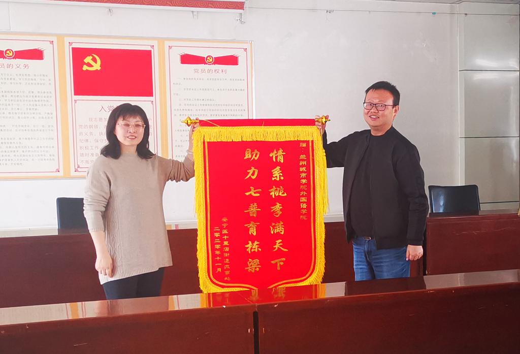 为充分发挥党员的先锋模范作用,强化大学生社会服务的功能,外国语学院组织100余名大学生党员、入党积极分子和共青团员担任安宁区十里街道人口普查员,参与第七次全国人口普查工作。日前,十里店街道办事处向外国语学院赠送了“情系桃李满天下,助力七普育栋梁”的锦旗表示感谢。
