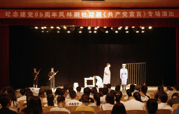 6月15日晚,由beat365风林剧社举办的庆祝建党95周年话剧《共产党宣言》专场演出在校本部大礼堂隆重上演。