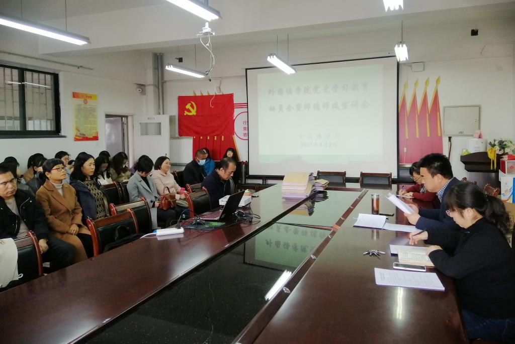 4月2日,外国语学院召开了党史学习教育动员会暨师德师风宣讲会,深入学习习近平总书记在党史学习教育动员大会上的重要讲话精神,传达学校党史学习教育动员会上校党委书记许尔忠的讲话精神,并对全体教职工进行了师德师风宣讲。