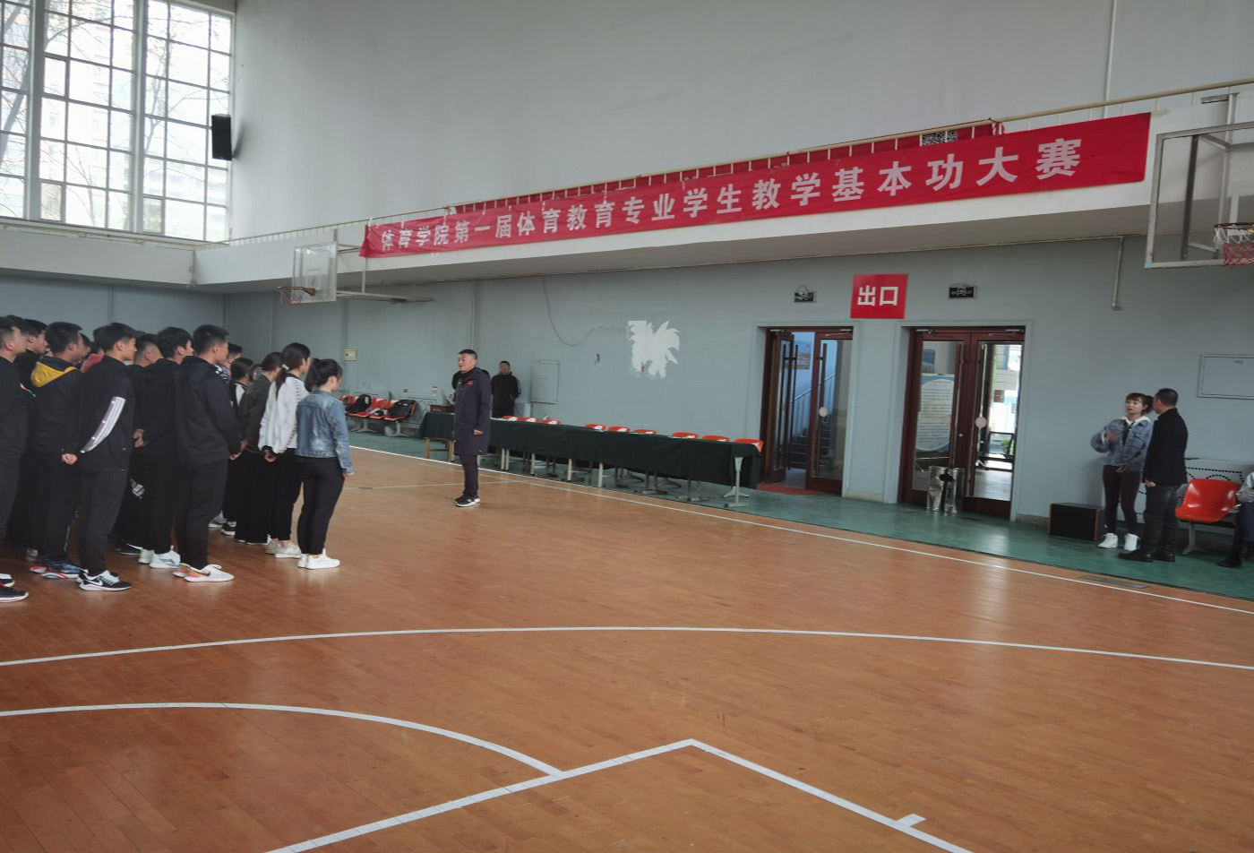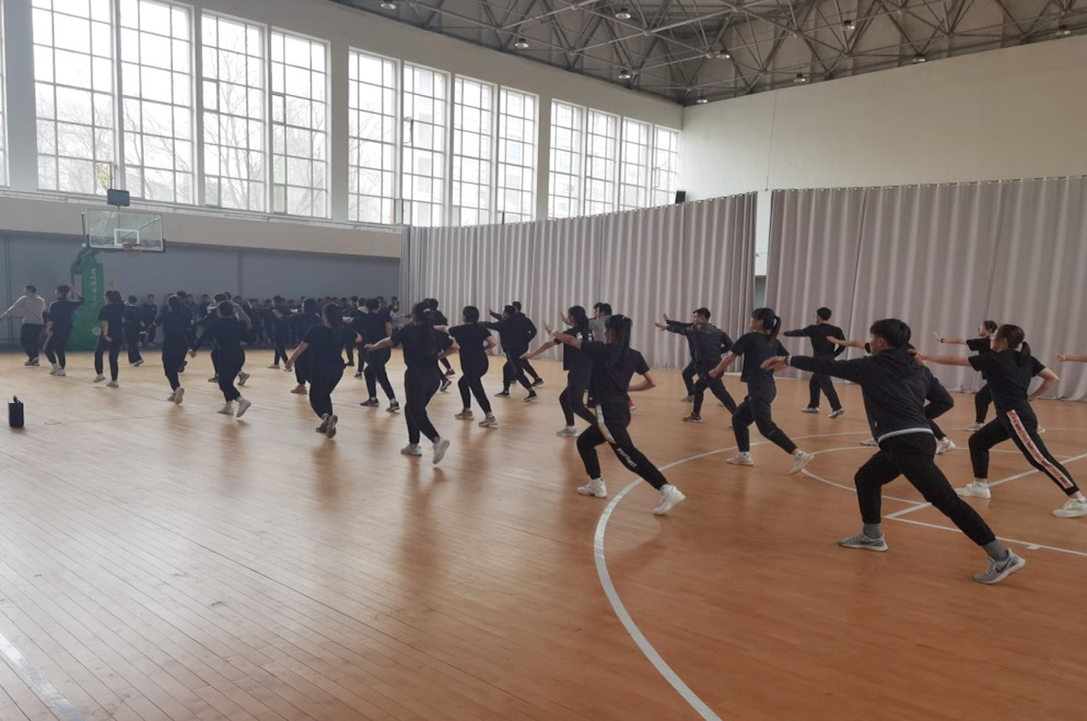 体育教学基本功大赛是对体育教育专业学生教师专业技能、课堂教学基本功的大检阅,也是积极推动学生专业成长的重要途径。比赛参照《兰州市中小学体育教师基本功大赛规程》中实践部分进行设计。首日比赛为团体赛,包括广播操、武术操、队列队形等三个项目,比赛以班为单位,轮流展示;次日比赛为个人技巧展示,包括足球、篮球、排球、体操、田径、健美操六个单项,由学生自主选择项目,单独展示运动技能。比赛过程中,各班同学精神饱满,动作整齐,号令统一,各项运动技术动作娴熟规范,充分展示了专业教学技能以及体育人的精、气、神。