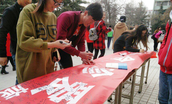 3月14日下午,旅游文化学院组织大一、大二各班级同学在综合楼前开展了“尊重生命,珍爱生命”的签名活动,藉此帮助同学们进一步认识到生命的可贵。每位在场的同学都在红条幅上郑重地写下自己的名字,留下了对生命的承诺与尊重。