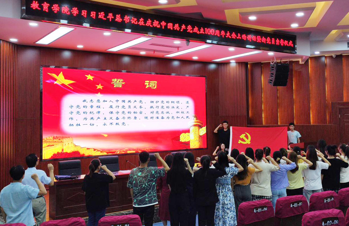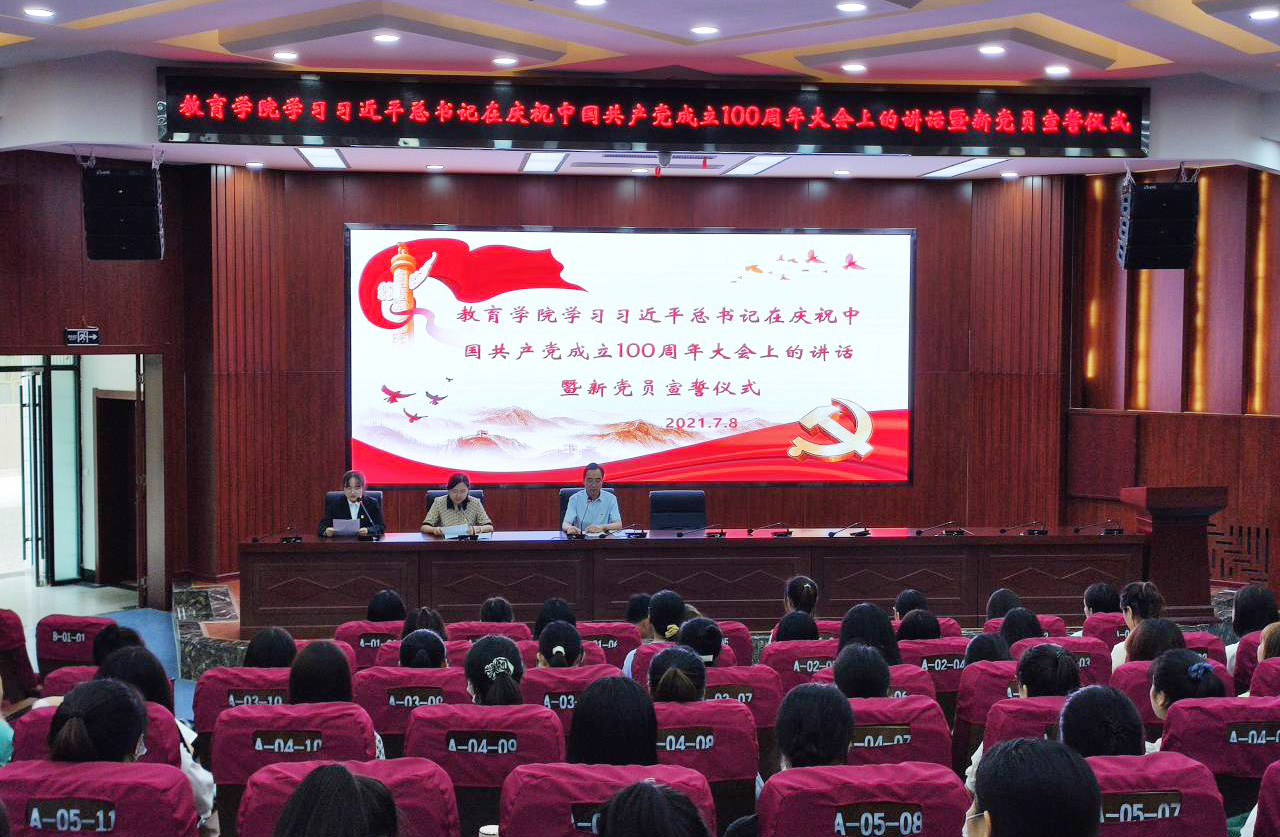 7月8日下午,教育学院党委在大学生活动中心召开会议,专题学习习近平总书记在庆祝中国共产党成立100周年大会上的重要讲话精神,并举行了新党员入党宣誓仪式。学院党委委员、学生党支部书记及全体学生党员参加了会议。