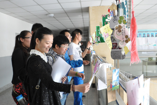 书签设计是此次系列活动的一大亮点。每位参赛者的作品在综合楼二楼走廊统一悬挂展出,一张张不同的设计风格的书签吸引着参观者的眼球:或是清新唯美、简约直观,或是幽默风趣、贴近当下时尚……每张书签配有文字来体现此次活动的主题:读书,遇见更好的自己;立身以立学为先,立学以读书为本;我因书而疯狂,我因书而幸福……参赛者以简练唯美的语言,为他们的作品锦上添花,获得了在场师生的赞赏。