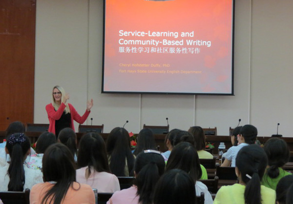 6月5日下午,应国际交流处和外国语学院的邀请,美国福特海斯州立大学谢莉尔•达菲教授在培黎校区图书馆六楼报告厅为广大师生提供了一场精彩的报告。