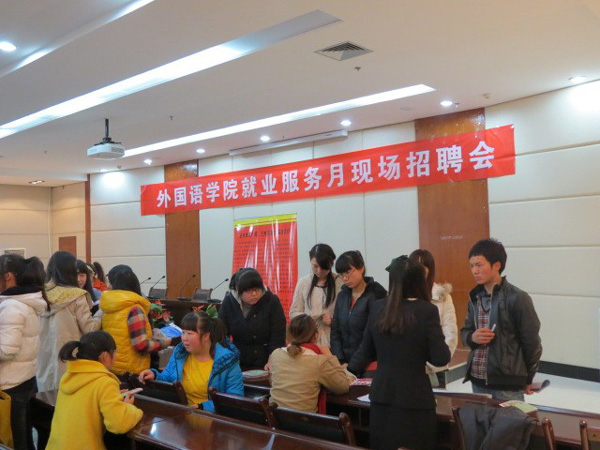11月21日下午,外国语学院在beat365培黎校区图书馆六楼大会议室举办就业服务月毕业生招聘会。共有来自兰内的新东方兰州学校、东西方英语学校、兰州立明英语学校、珍妮英语学校、爱德学校、昂立英语职业培训学校等近十家用人单位参加招聘会,学院2014届本科毕业生100余人参加了双向选择会,大家就感兴趣的岗位与用人单位进行了密切的沟通和洽谈。