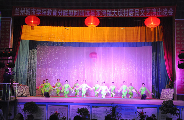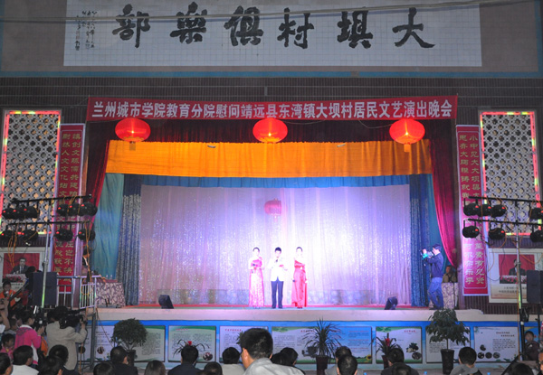 ,为了宣传党的十八大精神,服务新农村文化建设,探索校地合作发展机制,宣传学院人才培养成果,体验农村和谐社会建设成就,教育学院联合校团委组织80多名师生,赴靖远县东湾镇大坝村举行慰问演出。