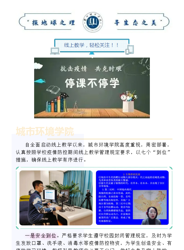 自全面启动线上教学以来,城市环境学院高度重视,周密部署,认真按照学校疫情防控期间线上教学管理规定要求,以安全到位、状态到位、上课到位、质量到位、育人到位、教研到位、践行到位等七个措施,确保线上教学有序、有效进行,教学质量不降低。