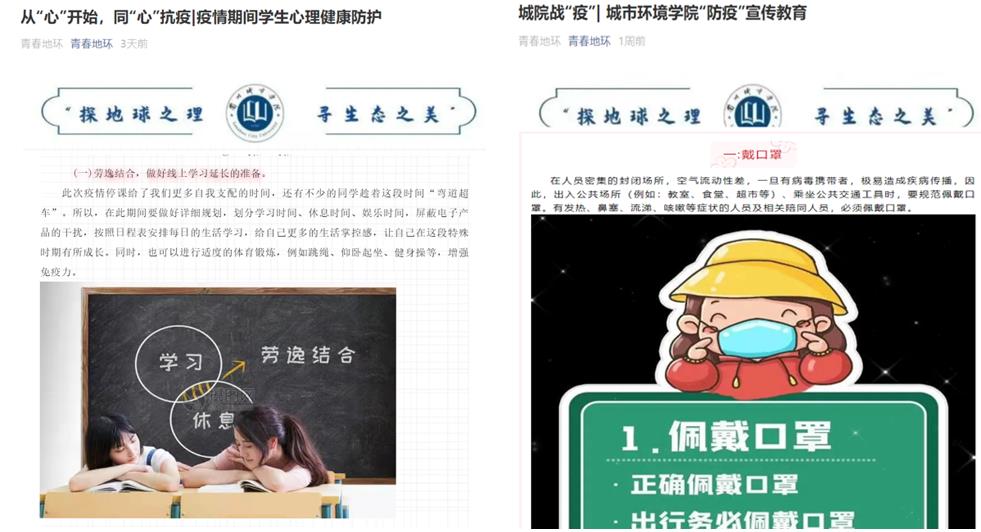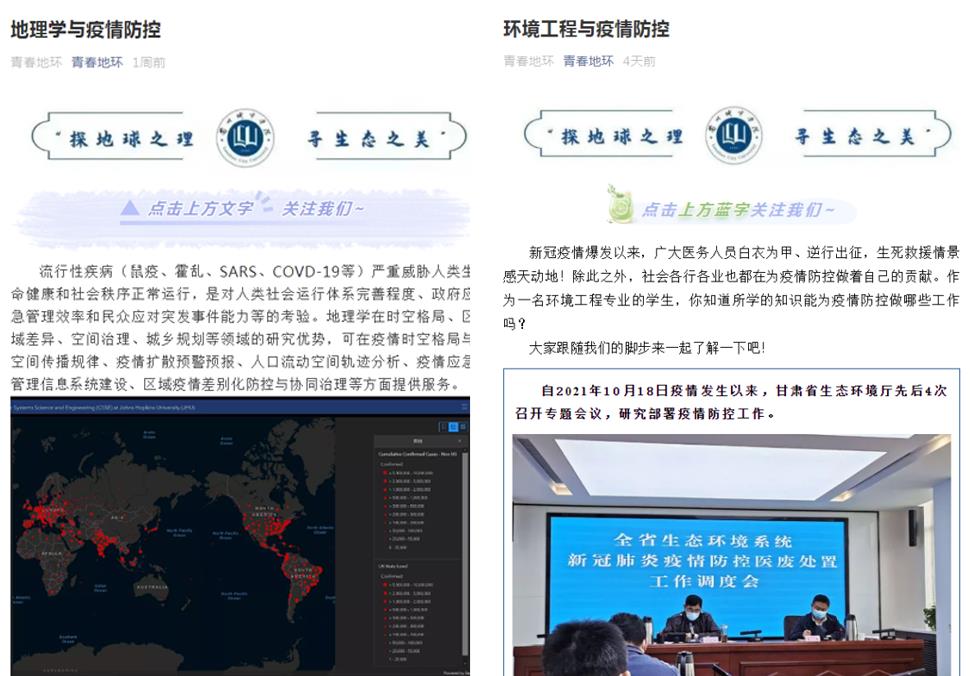 学院结合地理科学、地理信息科学与环境工程的专业知识,及时在公众号推送了地理学与疫情防控、环境工程与疫情防控,让广大同学们认识疫情,防控疫情。
