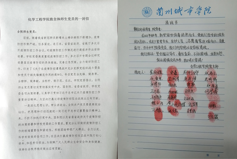 学院广大师生团结一心,众志成城。学院党委发出了致全体党员一封信,倡议全体师生党员切实贯彻落实上级决策部署,进一步严明疫情防控纪律,做好本职工作。学生党支部党员向学院党委递交了抗击疫情请战书,决心要坚决服从命令,不怕困难,坚决打赢疫情防控阻击战。