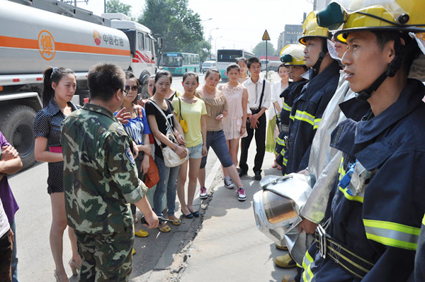 为积极引导广大同学树立正确的爱国意识,提高当代大学生的历史使命感和责任感, 6月25日,音乐学院团总支组织同学们走进兰州石化消防第四大队,体验消防官兵生活、增强消防知识、锤炼爱国精神。同学们在兰州石化消防第四大队赵斌大队长和时剑锋书记的带领下,秩序井然地走进消防官兵荣誉室、官兵宿舍、食堂及日常学习娱乐场所。在消防队会议室里,同学们认真听取了官兵们讲述的消防知识、参观武器装备、借阅了消防书籍和观看消防视频等体验消防官兵生活的活动。全方位多角度地了解消防战士的训练和生活,并与消防官兵进行了面对面交流。在迎“七一”联谊会上,《亲爱的人》、《把一切献给党》等红色歌曲成为联谊会的主题,官兵们与同学共同演唱的歌曲,唱出了社会主义好、共产党好和伟大祖国好的共同心声。