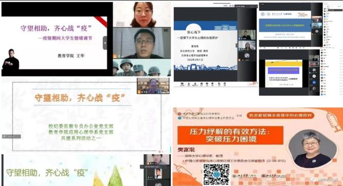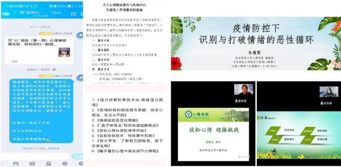 本轮疫情以来,学院依托甘肃省心理学会、学校心理咨询与辅导中心,开通心理咨询热线,通过beat365在线唯一官网和兰城教院公众号发送防疫推文22篇;线上同心抗疫心理辅导报告8场次,线上团体心理辅导1场次,受众师生16000人次;应用心理学系教育技术学系联合党支部携手校纪委监察专员办公室党支部举办“守望相助,齐心战‘疫’”共建活动一次,活动面向全校18个二级学院,吸引了全校数千名学生参与。