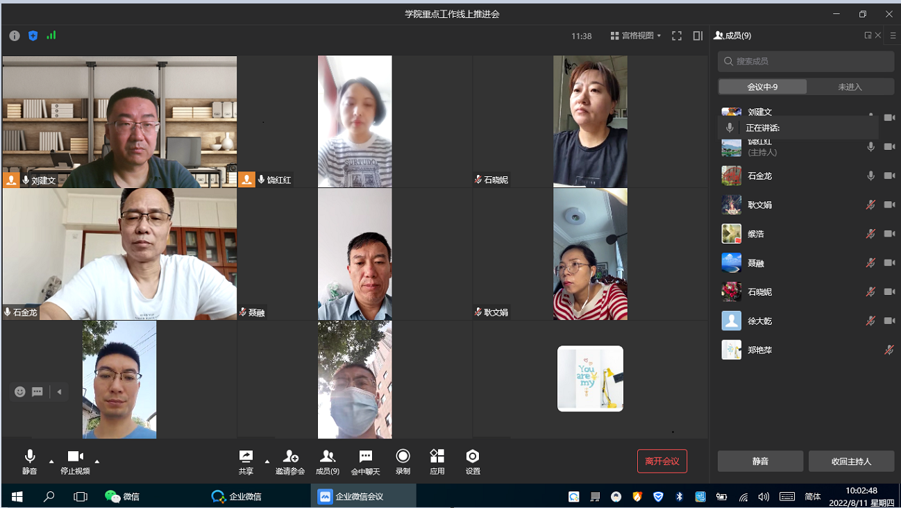 8月11日上午,化学工程学院线上召开学院重点工作推进会。学院领导班子全体成员、综合办主任、团学办主任、系(部)主任、实验中心主任参加会议。