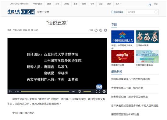 近日,由外国语学院马凌飞、詹晓燮等教师参与完成的《话说五凉》190集系列文化短视频节目英文字幕版在《中国日报》网正式上线开播(https://cn.chinadaily.com.cn/a/202209/21/WS632a8450a310817f312ef10f.html)。今年5月,该团队翻译的《斯文凉州》(A Discovery Journey Through Liangzhou Civilization) 英译本也由甘肃文化出版社正式出版发行。这一系列翻译成果是外国语学院与西北师范大学传媒学院共同致力于甘肃文化外译与对外传播的首次合作,也是学院发挥外语学科专业优势、服务国家“一带一路”倡议、助力甘肃文化国际传播的创新模式探索。