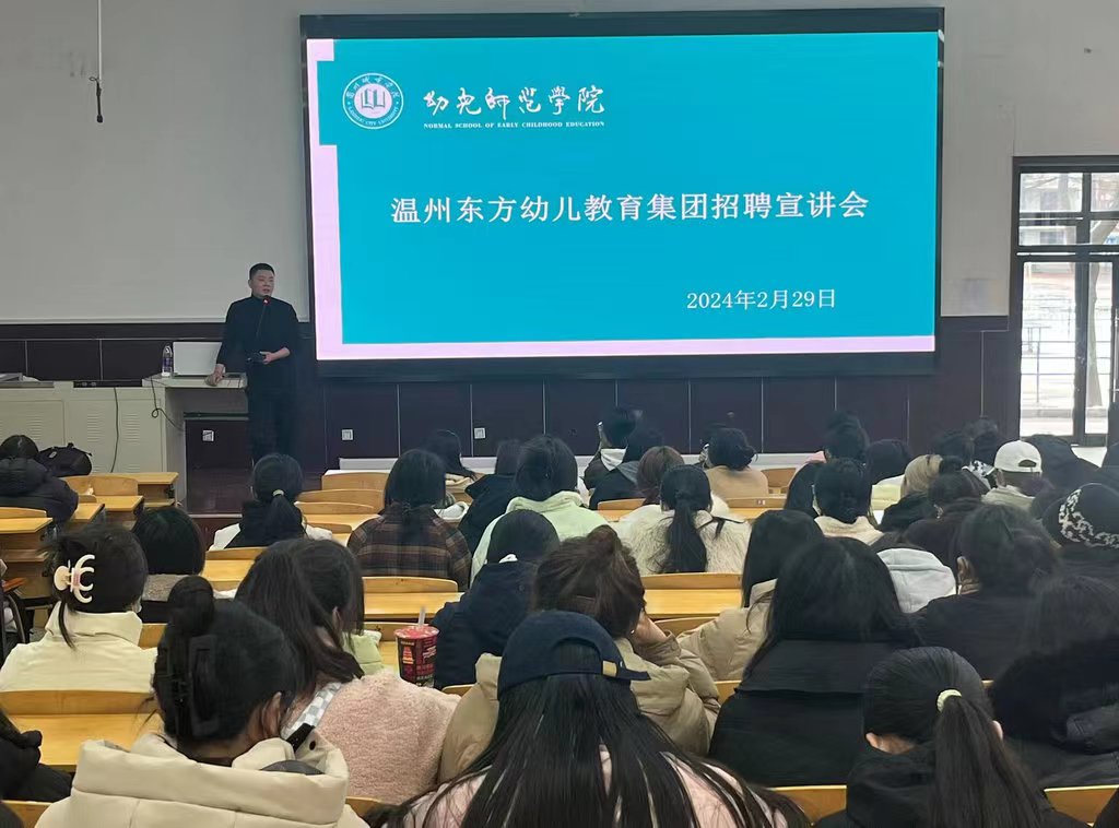 为切实做好2024届毕业生就业工作,加强学院与用人单位的交流,2月29日下午,幼儿师范学院邀请温州东方幼儿教育集团来院开展招聘宣讲会,2024届学前教育专业毕业生200余人参加。