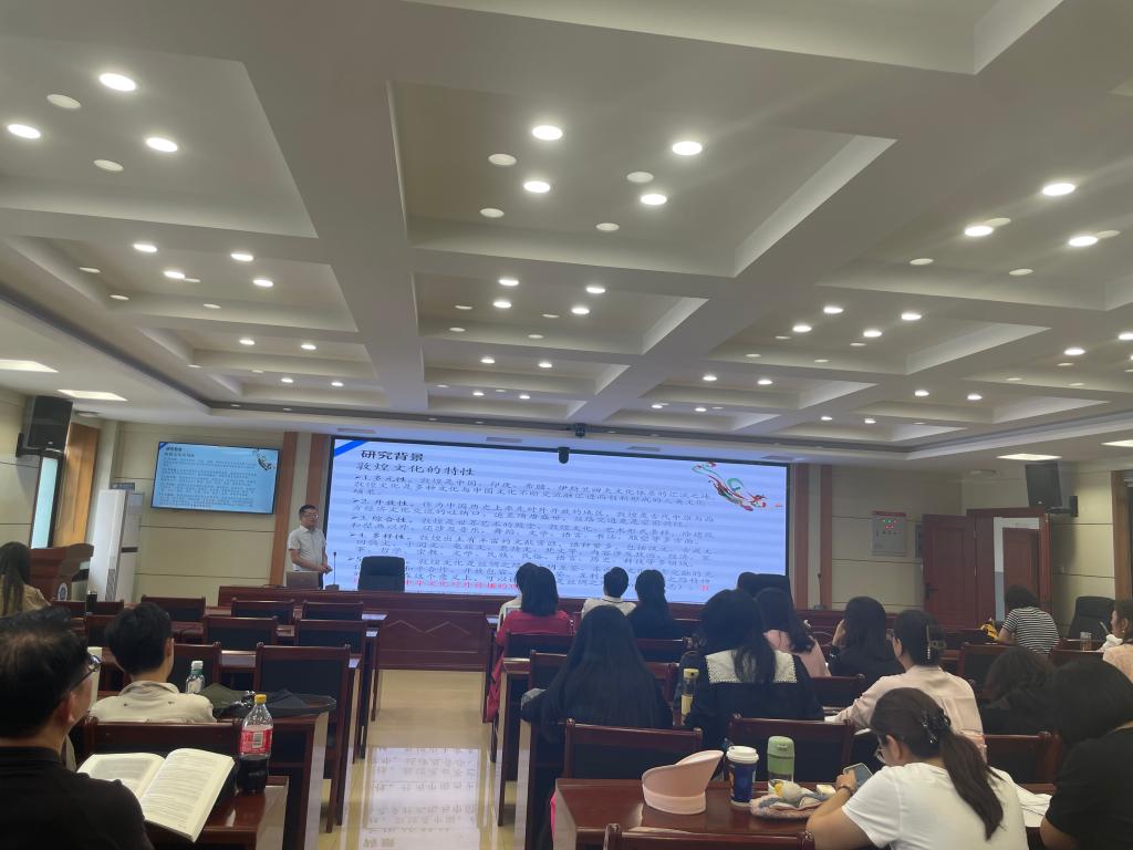 会议特邀beat365在线唯一官网原副校长、甘肃文化翻译中心主任、翻译学科带头人姜秋霞教授为全体教师作了题为《敦煌文化翻译中的译写研究——一种方法论视角》的学术讲座。她从变易论的理论视角出发,提出敦煌文化翻译传播中的语言转换要以源语文化为本、以翻译为介、以传播功能为导向,讲述了敦煌文化中的语言的音、形、意、象及概念图式,介绍了文化翻译中需要实现的话语功能,并通过大量翻译实例深入分析了文化翻译与传播中如何开展译写研究。姜秋霞指出,敦煌文化具有开放包容和综合多元等特色,在对外译介中需要充分考虑其民族性,蕴涵性及形象性等主要特征,这样才能更好更准确地做好敦煌文化外译与传播工作。讲座最后,姜秋霞就如何开展翻译学科建设和敦煌文化翻译与老师们进行了深入的交流与探讨,并逐一解答了老师们提出的问题。