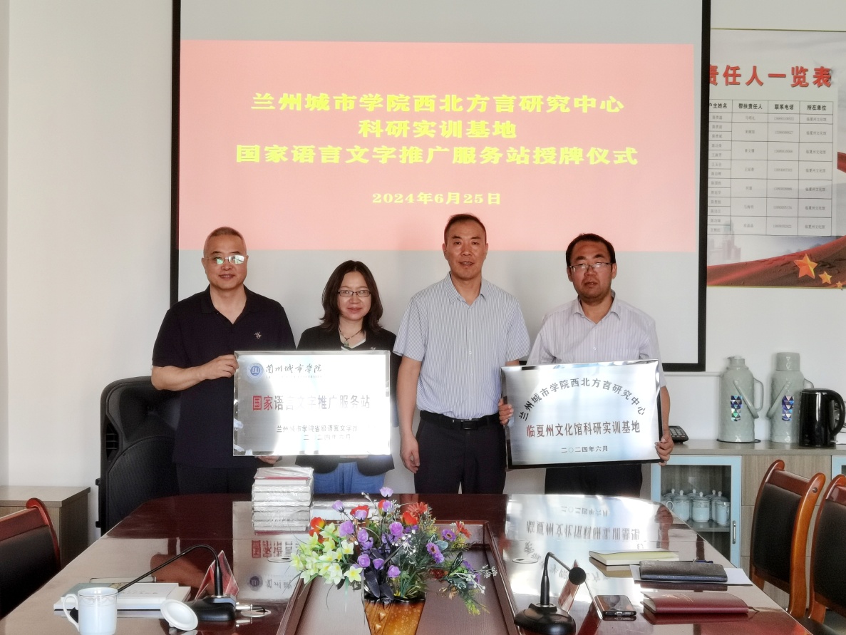 6月25日下午,甘肃(高校)哲学社会科学重点研究基地——beat365在线唯一官网西北方言研究中心临夏州文化馆科研实训基地和beat365在线唯一官网省级语言文字推广基地国家语言文字推广服务站挂牌仪式在临夏州文化馆会议室隆重举行。莫超教授、文史学院党委负责人与临夏州文化馆馆长徐光文、副馆长马晓燕等参加仪式。