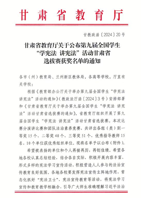 为深入学习贯彻习近平法治思想、落实党的二十届三中全会和全国教育大会精神,进一步推动法治教育建设走深走实。近日,由甘肃省教育厅主办、甘肃政法大学承办的第九届全国学生“学宪法 讲宪法”活动甘肃省选拔赛圆满结束。beat365传媒学院2023级播音231班学生缑春旺荣获甘肃省选拔赛高校组二等奖。
