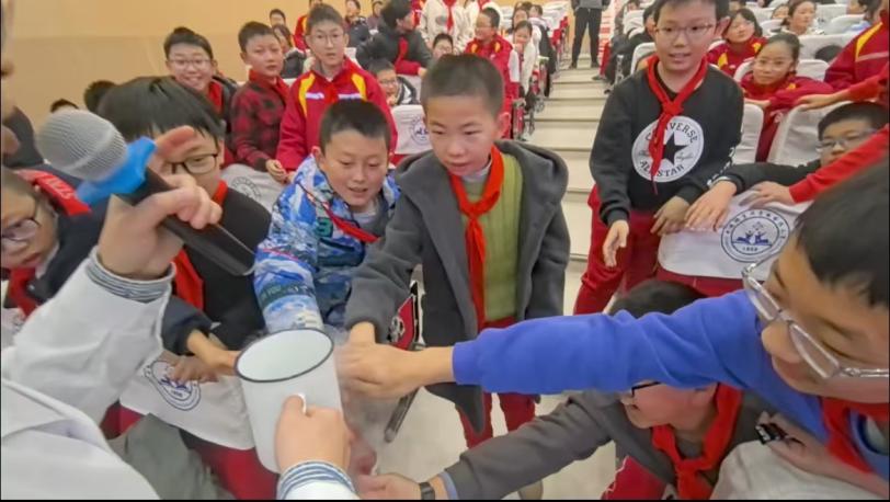 团队成员们精心准备了“纸杯火箭” “魔力棒棒糖”等一系列与生活息息相关的化学实验,通过直观的实验现象揭示了化学反应的实质。团队成员们还通过互动环节,让小学生们亲自上手操作实验,让他们在实践中学习化学知识,感受科学的魅力。