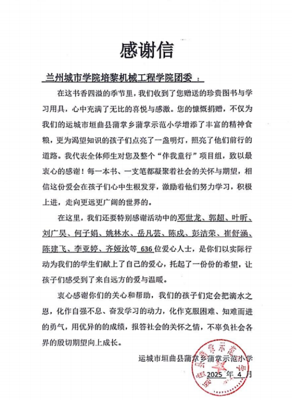 培黎机械工程学院开展“捐书筑梦,情暖三月”活动收到感谢信
