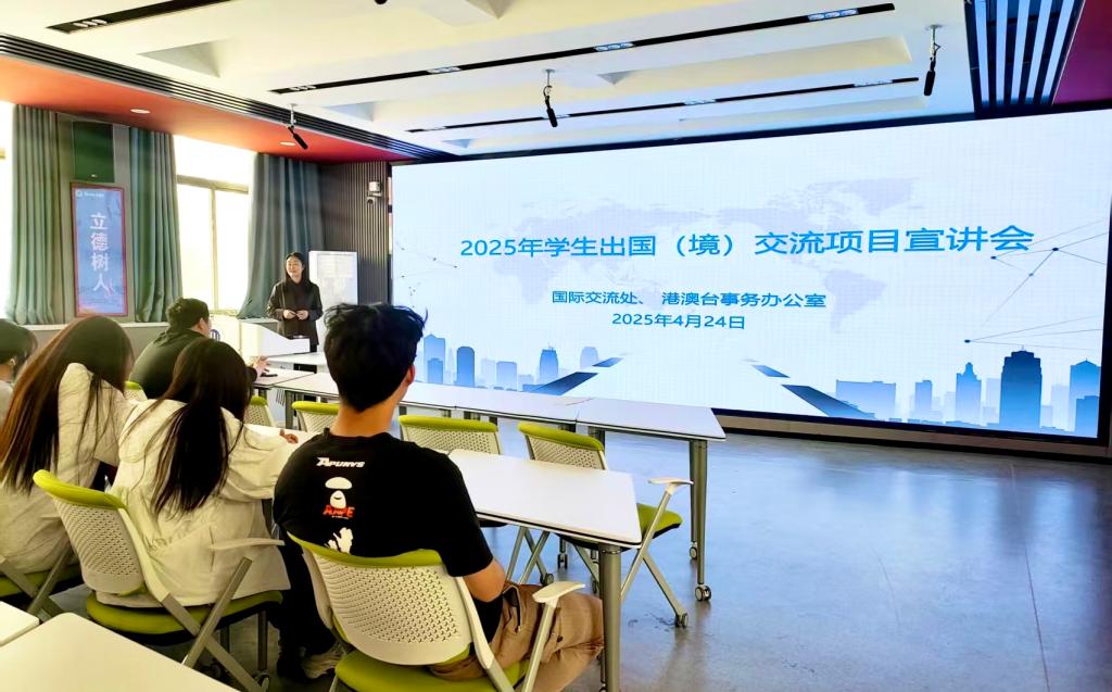 为有效实施学校开放办学工程,拓展学生国际视野,帮助学生了解学校出国(境)学习交流项目,提前做好个人学业职业发展规划,4月24日下午,国际交流处在博文楼VR体验教室举办 2025年学生出国(境)交流项目宣讲会。全校有意向参加出国(境)交流项目的在校学生及国际交流处工作人员参加此次会议。