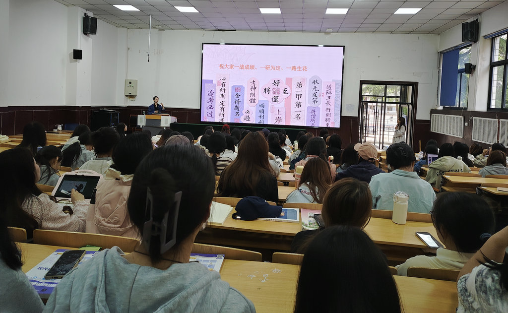 主讲教师以“道阻且长,行则将至”为题,从自我分析、院校选择、备考指南、心态调整和方法技巧等方面展开讲解。并结合自身学习经历,用通俗易懂话语分享研考实用信息。他强调,要科学分析自我,院校选择以“考得上”为原则,综合考虑学习实力、地域因素与个人兴趣,避免盲目跟风;备考复习要分科突破,科学规划;要持续做好心态调整,张弛有度。