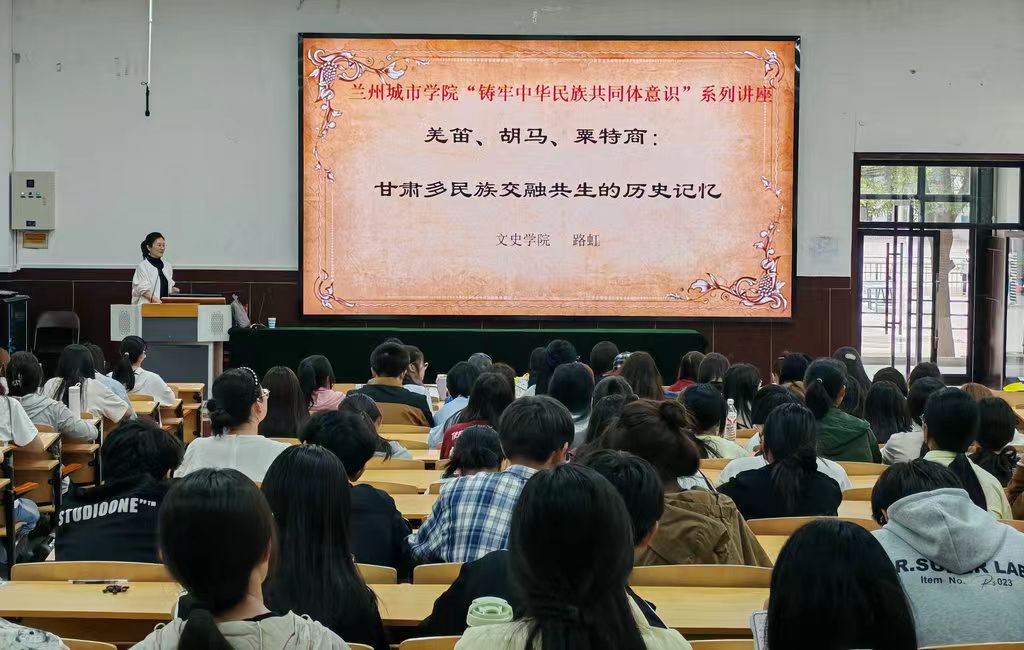 路虹以甘肃民族特色饮食开篇,引出甘肃自古以来就是多民族聚居地的话题。通过汉简、敦煌文献、考古发掘、文学作品等大量史料和遗址古迹图片呈现,讲述乌孙、匈奴、粟特、吐谷浑等古老族群在甘肃的活动。以大量鲜活生动的历史细节,真实再现各民族在甘肃各地交流交往交融的历史场景。阐释了各民族在甘肃的和谐共处、交汇融通、互鉴共生的历史渊源,展现出甘肃历史文化作为中华民族共同体意识的“精神蓝本”所具备的创造力和包容性。路虹在讲座中谈到,文化认同是最深层次的认同,是民族团结之根、民族和睦之魂,我国各民族共同书写了辉煌的中国历史,共同创造了灿烂的中华文化。中华民族历经几千年发展,形成了多元一体的民族实体,是各民族你中有我、我中有你、血脉相连、不可分割的有机整体。希望同学们充分发挥地域优势,挖掘历史资源,讲好甘肃这片土地上生活的各民族休戚与共、荣辱与共、生死与共、命运与共的历史故事。不断构筑中华民族共有精神家园,为铸牢中华民族共同体意识奠定坚实的精神和文化基础。