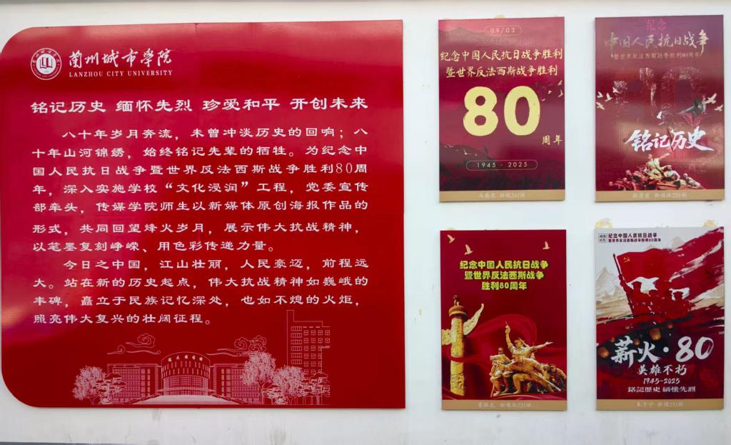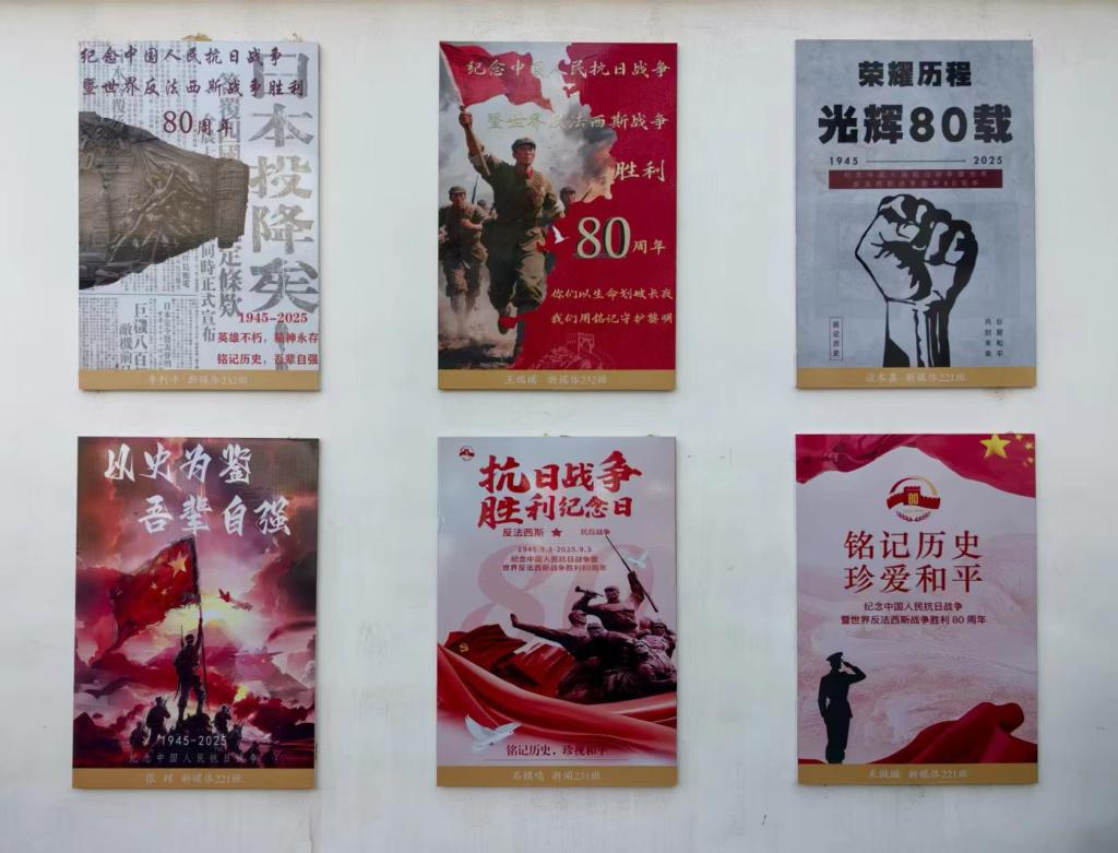 系列海报已在校园文化墙集中展示,形成良好的宣传效果,吸引了众多师生驻足观看和讨论,进一步增强了纪念活动的传播力和影响力。活动既展示了学生的专业实践能力,也体现了他们深厚的爱国情怀。