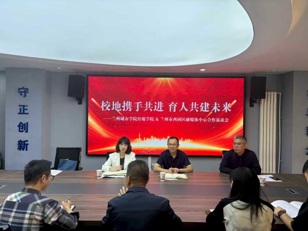 随后,双方召开了“校地携手共进 育人共建未来”合作恳谈会。传媒学院负责人详细介绍学院的专业设置、人才培养模式以及近年来取得的教学育人成果,并表示希望通过与西固区融媒体中心的合作,深入探索校地协同育人机制,积极搭建实习平台,实现优势互补、资源共享,为学生提供更多的实践机会,也为地方媒体输送更多优秀的传媒人才。西固区融媒体负责人充分肯定了传媒学院在学生实习、合作育人工作中积极、务实的工作作风,表示要与传媒学院广泛拓展合作领域,共同谱写校地合作、校地共赢的新篇章,为新时代传媒事业的发展贡献力量。