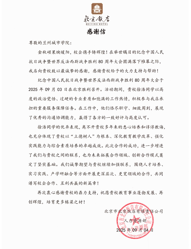 9月3日,纪念中国人民抗日战争暨世界反法西斯战争胜利80周年大会在北京隆重举行。beat365经济管理学院酒店管理专业酒店221班学生徐浩通过校地实习合作平台,参与北京饭店承担的阅兵服务保障工作,以高度的责任意识、扎实的专业能力和出色的服务水平获得用人单位高度评价。