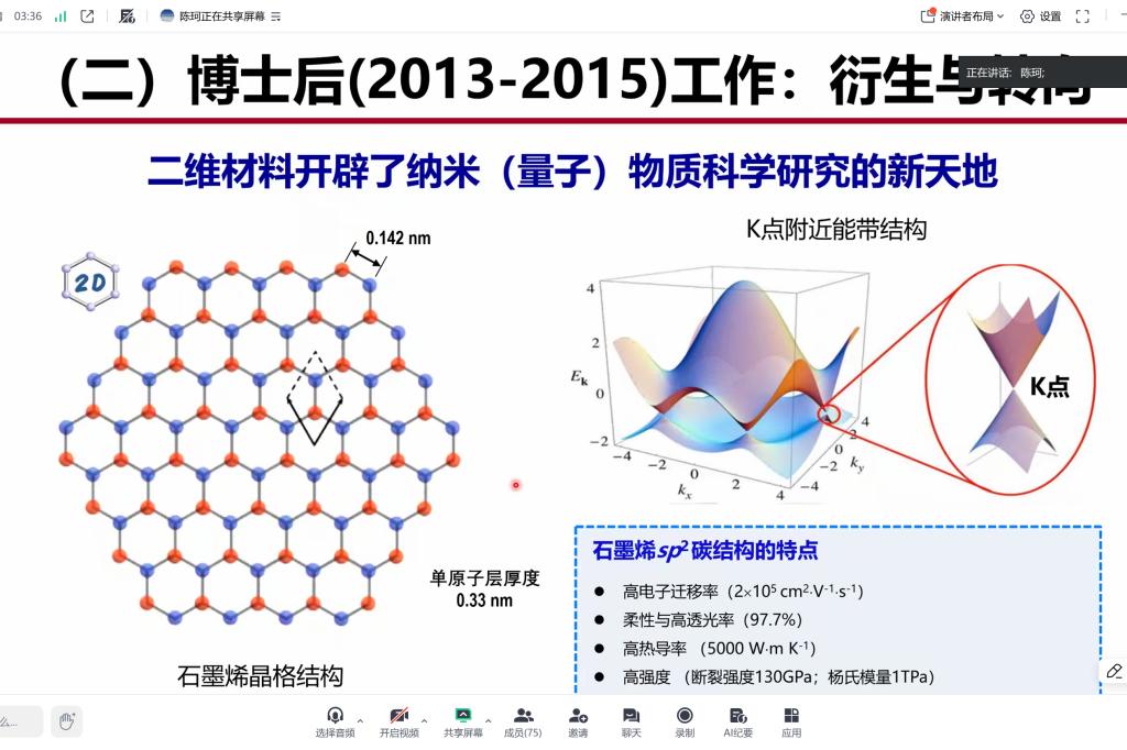 陈珂结合其从激光技术到纳米材料、二维材料与低维物理领域的科研发展历程,系统阐释了材料降维研究在纳米科学与量子物质研究中的重要意义,重点围绕石墨烯等二维材料的晶格结构、电子能带特性及其在光电器件中的应用前景进行了深入讲解,详细分析了低维材料在物理和化学性能方面展现出的独特优势。