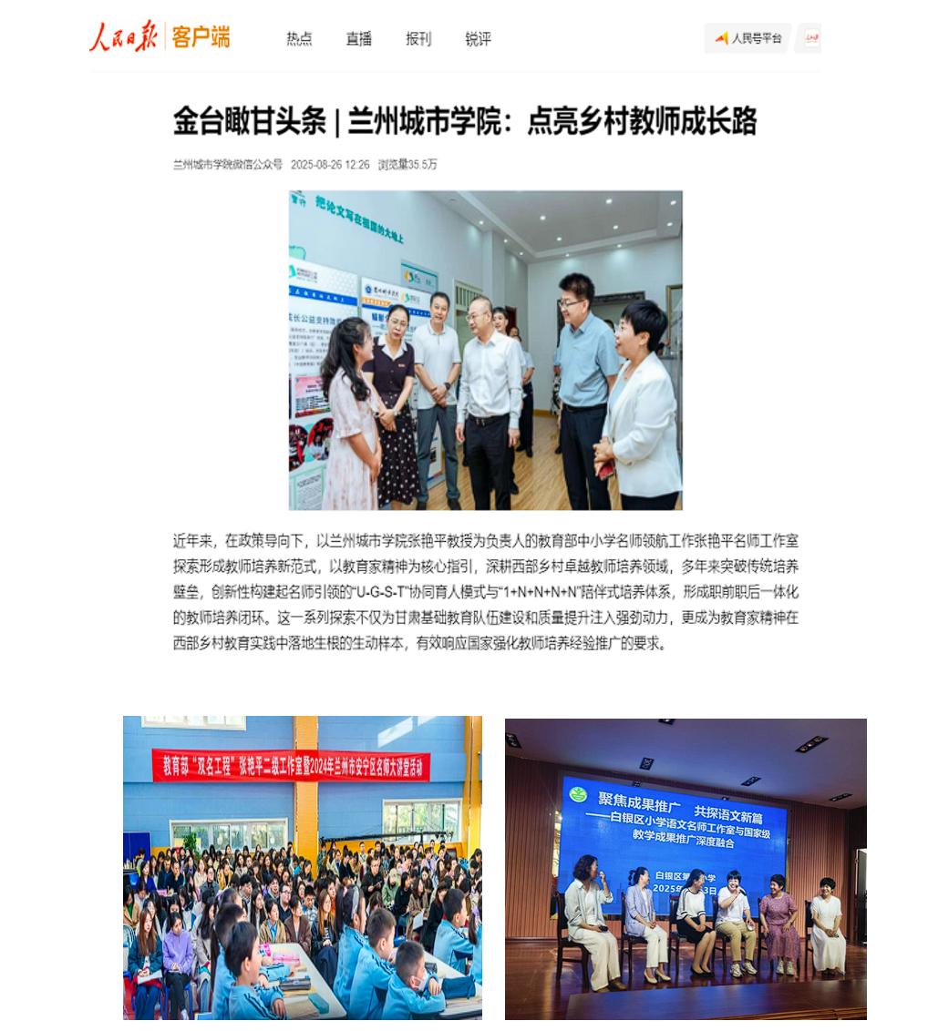 依托教育部中小学名师领航工程、国家级“万人计划”教学名师张艳平工作室,立足甘肃,辐射西部。以教育家精神为核心指引,创造性构建起名师引领的“U-G-S-T”协同育人模式与“1+N+N+N+N”陪伴式培养体系,形成“理论支撑—政策保障—实践锤炼—精准指导”的职前职后一体化的教师培养闭环,以“陪伴式引领”创建大学教师与小学教师共创共生的学习共同体,赋能西部乡村教师专业发展。2024年9月,《人民日报》对张艳平名师工作室师资培训的成就进行了报道。2024年12月,工作室成员参加了第四届全国名师工作室创新发展成果博览会,并向大会做了成果展示和交流。2025年,承接国家级名师、教育部“双名计划”名师培养对象工作室示范培训项目,并与白银市教育局签署“国家级教学成果奖《小学语文“童行”习作体系的构建与实施》白银地区推广应用三年行动计划(2025-2027年)”,积极开展相关活动。