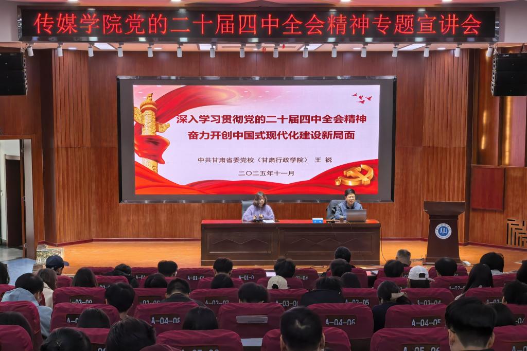 121日下午,传媒学院举办党的二十届四中全会精神专题宣讲会,邀请中共甘肃省委党校(甘肃行政学院)王锐教授作专题宣讲。学院领导班子成员、全体教工党员、学生党员代表及党外人士参加会议。