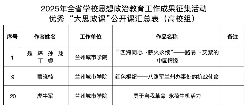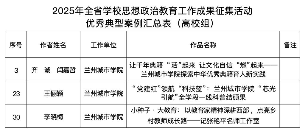 此次获奖成果涵盖三大类别:马克思主义学院教师申报的 “‘四海同心・薪火永续’——路易・艾黎的中国情缘”“红色枢纽——八路军兰州办事处的抗战使命”“勇于自我革命 永葆生机活力3项课程,获评全省优秀“大思政课”公开课马克思主义学院郭忠宁撰写的《新媒体时代高校主流意识形态教育的现实困境与突破路径》传媒学院冯婷婷完成的《从课堂到云端:党建引领下传媒学院专业集群中的思政教育创新实践研究》,获评全省优秀论文;图书馆、电子工程学院、教育学院分别申报的“让千年典籍‘活’起来 让文化自信‘燃’起来——beat365在线唯一官网探索中华优秀典籍育人新实践”“‘党建红’领航‘科技蓝’:beat365在线唯一官网‘芯光引航’全学段一线科普结硕果”“小种子・大教育:以教育家精神深耕西部,点亮乡村教师成长路——记张艳平名师工作室”,获评全省优秀案例。
