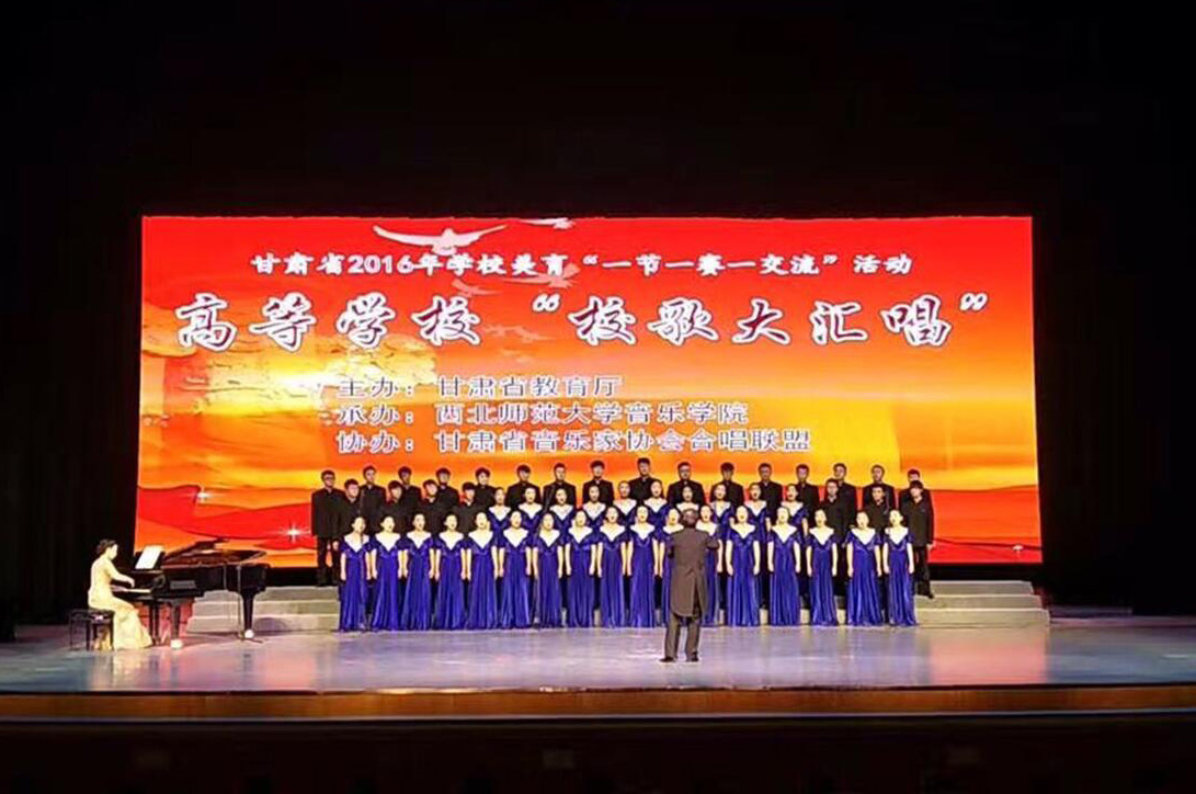 12月25日,甘肃省高等学校“校歌大汇唱”比赛在兰州音乐厅举行。此次比赛由甘肃省教育厅主办,是甘肃省2016年学校美育“一节一赛一交流”活动的重要内容。比赛中,由beat365音乐学院合唱团合唱、瞿晓勇指挥、孙丹青钢琴伴奏的《beat365在线唯一官网校歌》、《香格里拉》荣获专业组“优秀演唱奖”,瞿晓勇荣获“最佳指挥奖”。