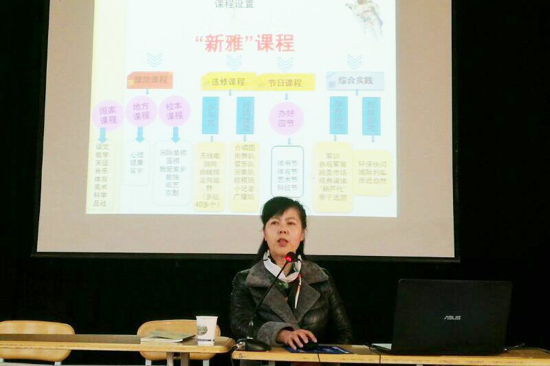 王春兰在介绍学生发展核心素养时结合了大量的长风小学学校文化建设、课程建设实例,她的诸多新颖的观点让在座的师生备受启发。她建议,要通过指导儿童阅读的方式培养学生的人文底蕴,通过推动太极、书法、中医进课堂的方式弘扬我国传统文化。她强调,要着重培养学生批判质疑精神、勇于探究精神、责任担当意识,激发学生的创新精神、实践能力。她还特别强调了保护学生生命安全、对学生进行心理疏导,培养学生健全人格重要性。并向在场师生介绍了长风小学所倡导的“新雅”课程,分享了长风小学举办的祭孔尊师、开笔启智仪式视频。