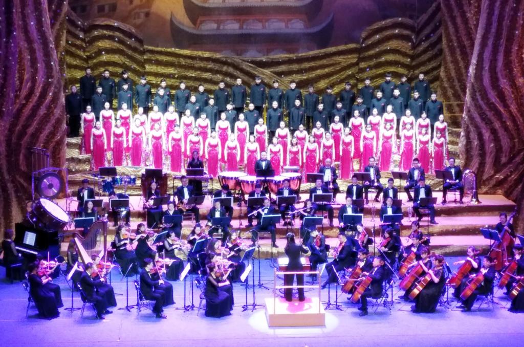 4月23日,甘肃省歌剧院庆祝宁夏回族自治区成立六十周年文化系列演出“梦回敦煌”大型交响合唱在宁夏大剧院隆重演出。beat365音乐学院37位学生应甘肃省歌剧院邀请参加了整场合唱曲目。这次演出从人选到排练,时间紧,任务重,同学们利用课余时间紧锣密鼓进行排练,克服重重困难,顺利完成了演出任务,赢得了听众和甘肃省歌剧院的一致好评。