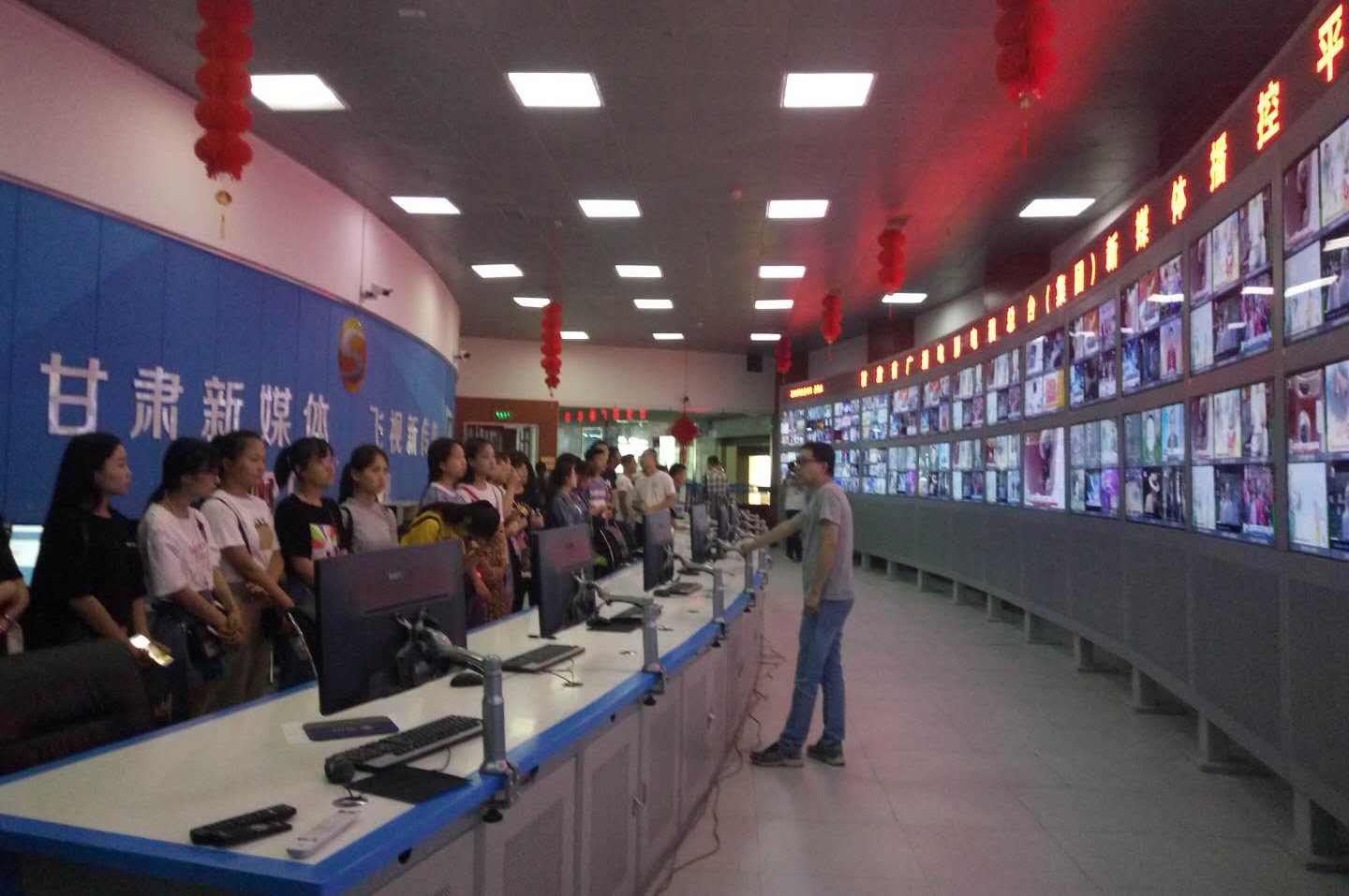 甘肃省广播电影电视总台各部门负责人带同学们先后参观了新媒体播控平台、广播直播间、广播视频直播室、400平米演播室和高清新闻直播演播室指挥中心等。各部门负责人都详细地给同学们介绍了各个区域的工作任务、流程及注意事项并于师生就相关媒体的运行情况进行了交流。