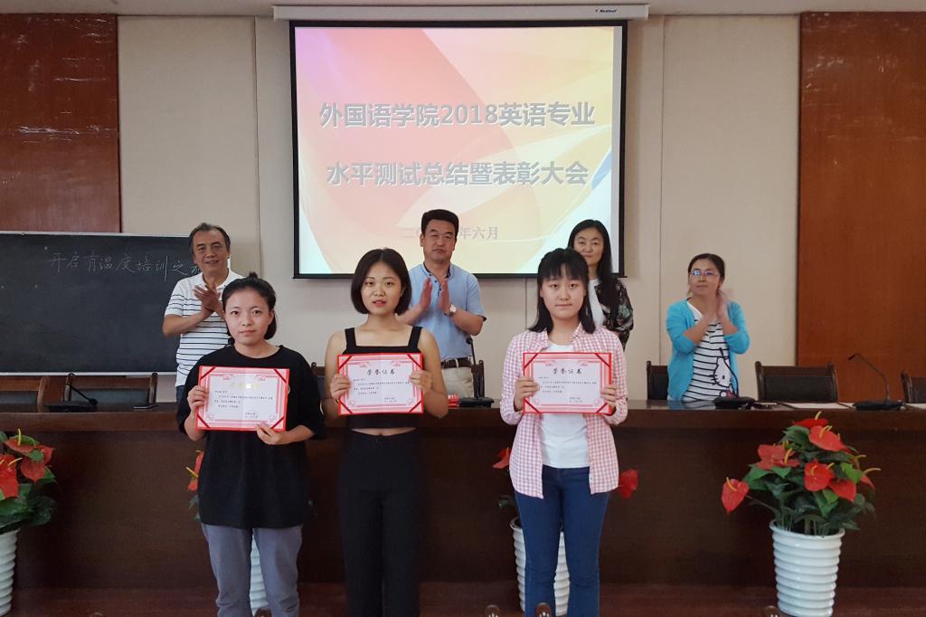 大会对柴妍婷等17名测试成绩优秀者进行了表彰。相关专业教师就水平测试中综合、听力、词汇与阅读、语音各分项内容进行了细致分析总结,为同学们指出了得分较低的原因,也通过分析近三年英语水平测试成绩柱状图,让同学们找到了差距。