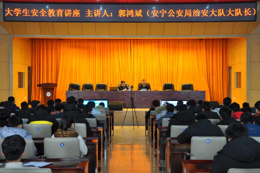12月28日下午,为增强同学们的安全意识,提高自我保护能力,创建平安校园,体育学院邀请安宁公安分局治安大队大队长郭鸿斌,在逸夫图书馆六楼为全体学生举办了安全教育讲座。