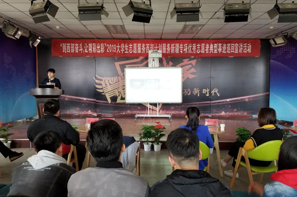 4月15日下午,“到西部奋斗,让精彩出彩”——2019年大学生志愿服务西部计划服务新疆专项优秀志愿者典型事迹巡回宣讲活动在校本部博雅讲堂举行。吕雅琴、韩自超、张浩、李明辉、曹雅静、张勐等六位优秀志愿者代表畅谈了在新疆的志愿服务事迹,各学院200余名学生代表聆听了本次报告会。
