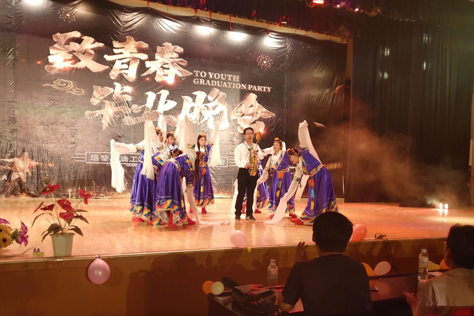 晚会在青旋舞蹈团热情四射的舞蹈《Senorita》中拉开了序幕,随着一个个精彩节目的进行,台下的同学们充满了欢声笑语。在《给我翅膀》的歌声中,晚会落下了帷幕,毕业生们久久不愿离去,享受着他们在毕业前的最后一次欢聚。