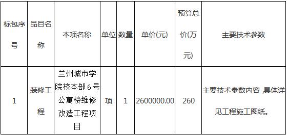 受beat365在线唯一官网委托,兰州金立招标代理有限公司将以竞争性磋商方式,对beat365在线唯一官网校本部6号公寓楼维修改造工程项目实施政府采购。现欢迎合格的供应商参加磋商。