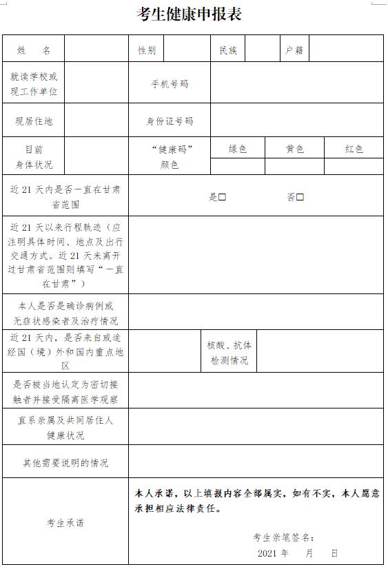 3.国(境)外入境考生、国内中高风险地区考生、既往感染者(确诊病例或无症状感染者)、感染者的密切接触者,应主动报告(联系电话:0931-5108881),并提供相关证明材料,不能提供证明材料的,不能参加本次资格复审。